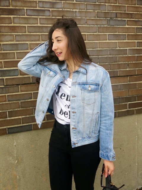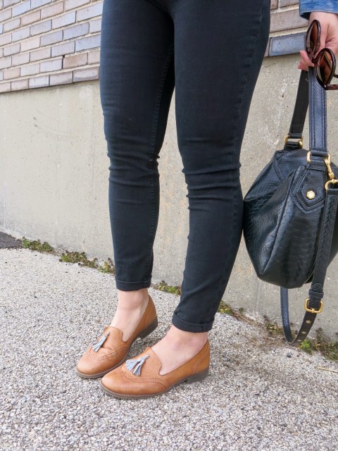 Late for a lunch date. Curled hair from the day before. Ten minute makeup. What else is new? It was super windy cold this day but of course I was in denial (SINCE IT’S SPRING) so I went straight for my new light denim jacket and t-shirt from H&M. Just to look a little more put together I tucked my t-shirt into these black high-waisted jeans and added these tan oxfords 🙂 Perfect for a casual (Spring 😑) day out and about!