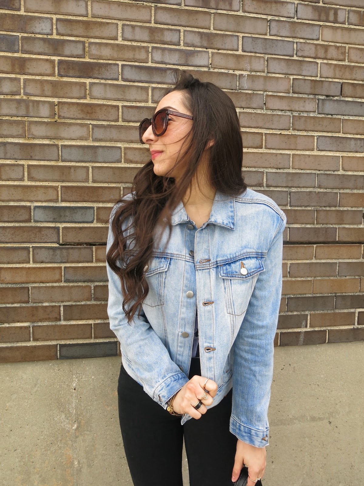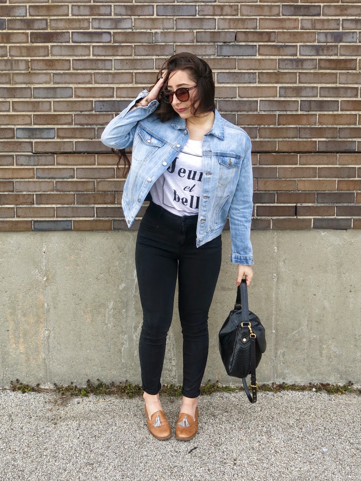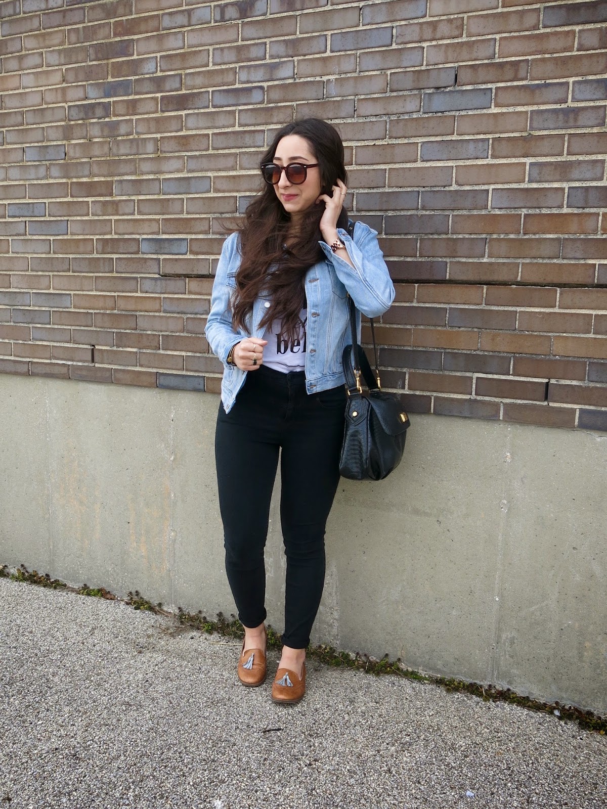 Late for a lunch date. Curled hair from the day before. Ten minute makeup. What else is new? It was super windy cold this day but of course I was in denial (SINCE IT’S SPRING) so I went straight for my new light denim jacket and t-shirt from H&M. Just to look a little more put together I tucked my t-shirt into these black high-waisted jeans and added these tan oxfords 🙂 Perfect for a casual (Spring 😑) day out and about!