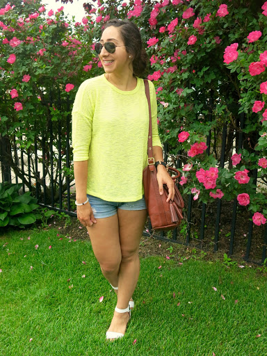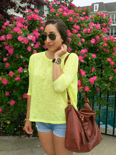 Sweater: Forever 21 // Shorts: Marshall’s // Shoes: Target // Bag: Coach // Sunglasses: Ray-Ban // Watch: Michael Kors // Lokai Bracelet