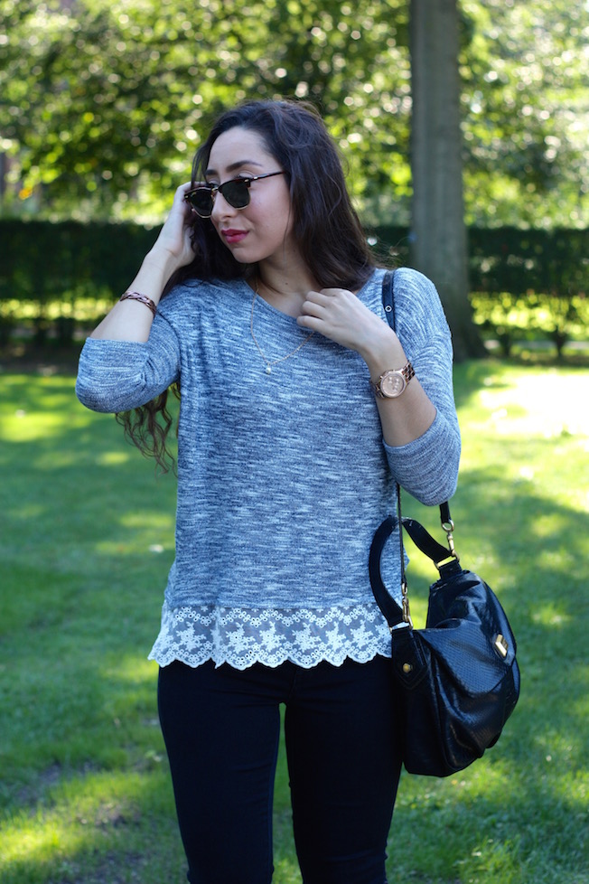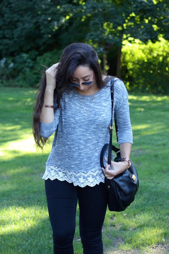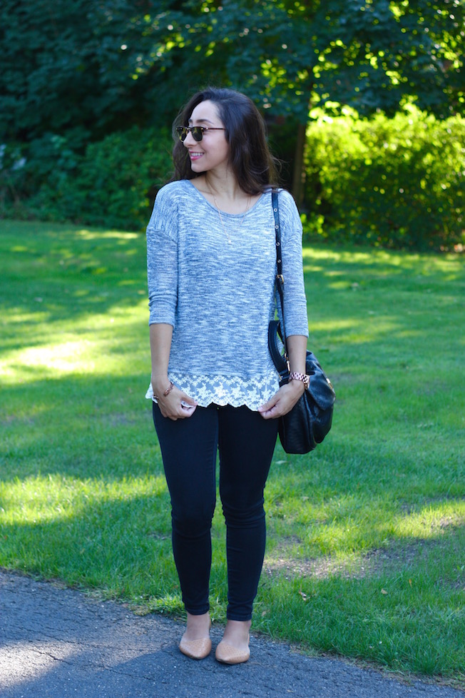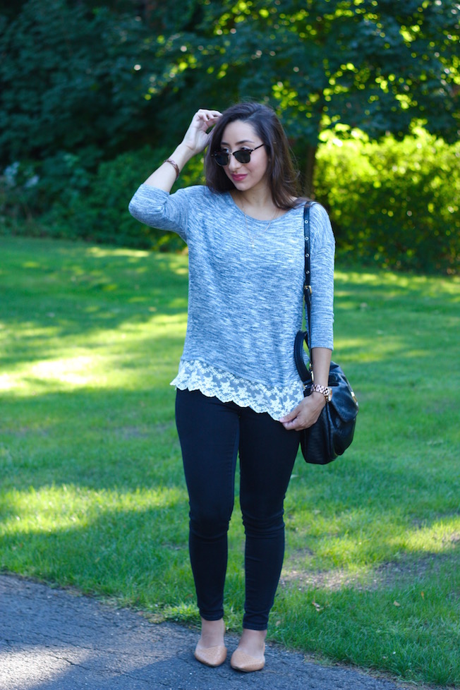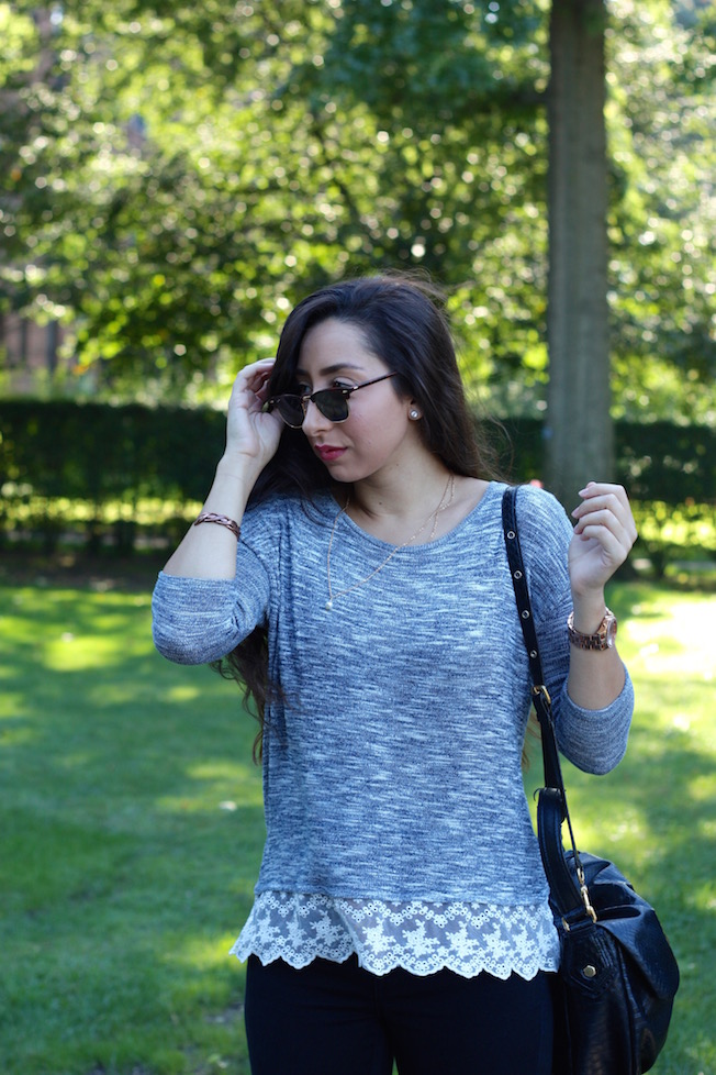 I’ve been loving this light sweater lately, its perfect for the early fall! The bottom lace gives it a nice and pretty layered touch that goes so perfect with this pearl pendant layered chain necklace I received from Jonny Kay recently! This necklace is not yet available but I’ll be doing a giveaway with it starting tomorrow and all the details on how to enter will be on my Instragram 🙂 Make sure to check it out!
