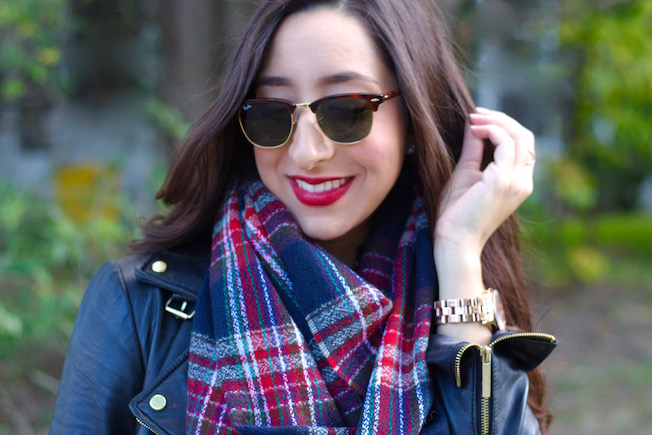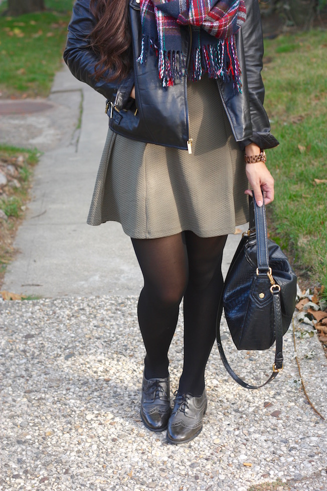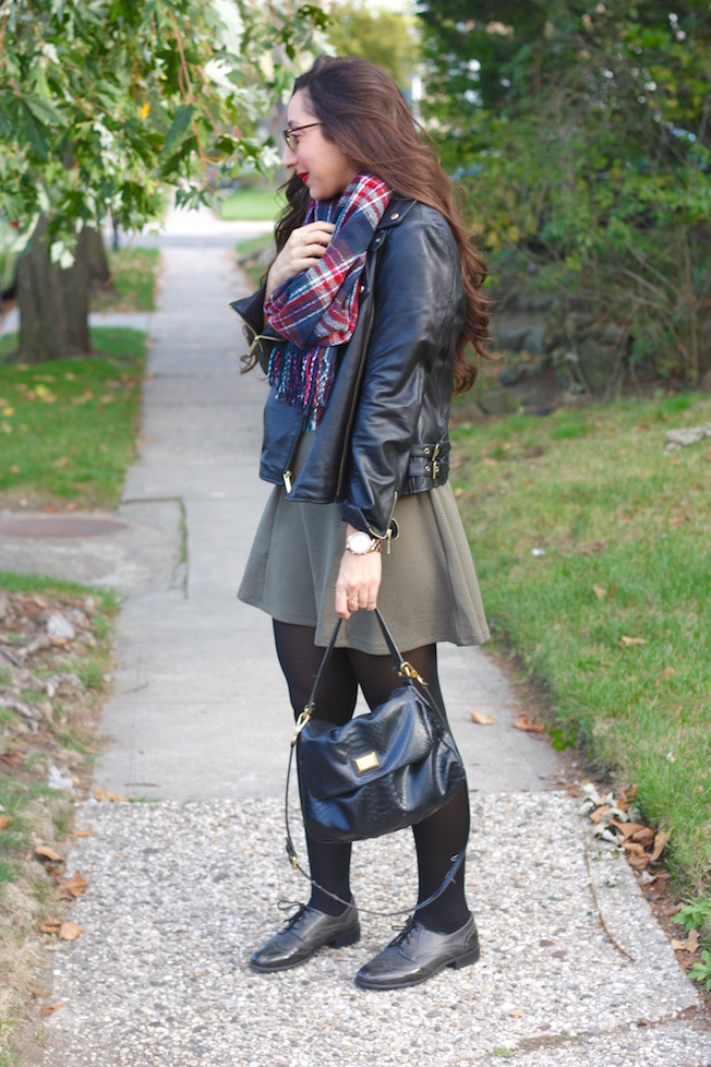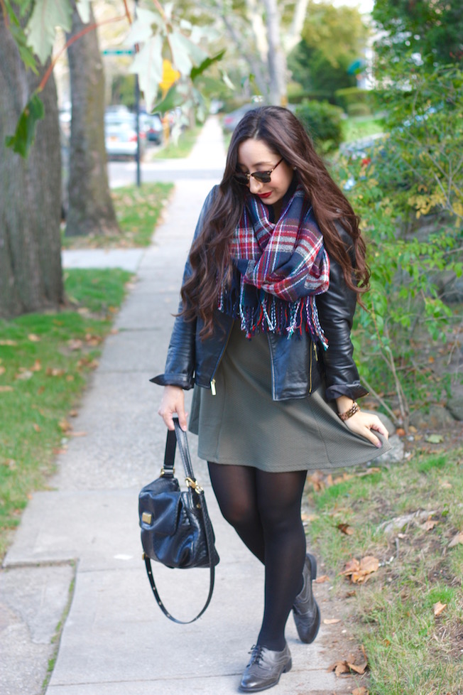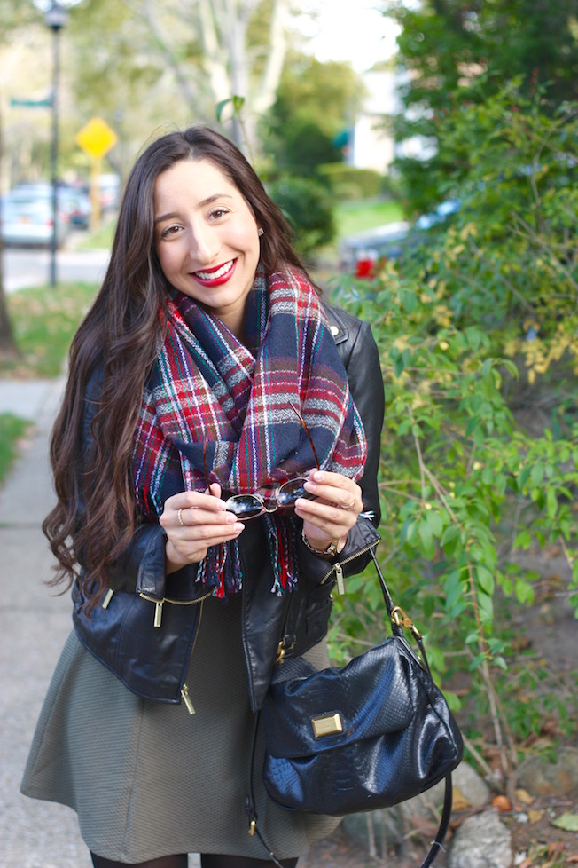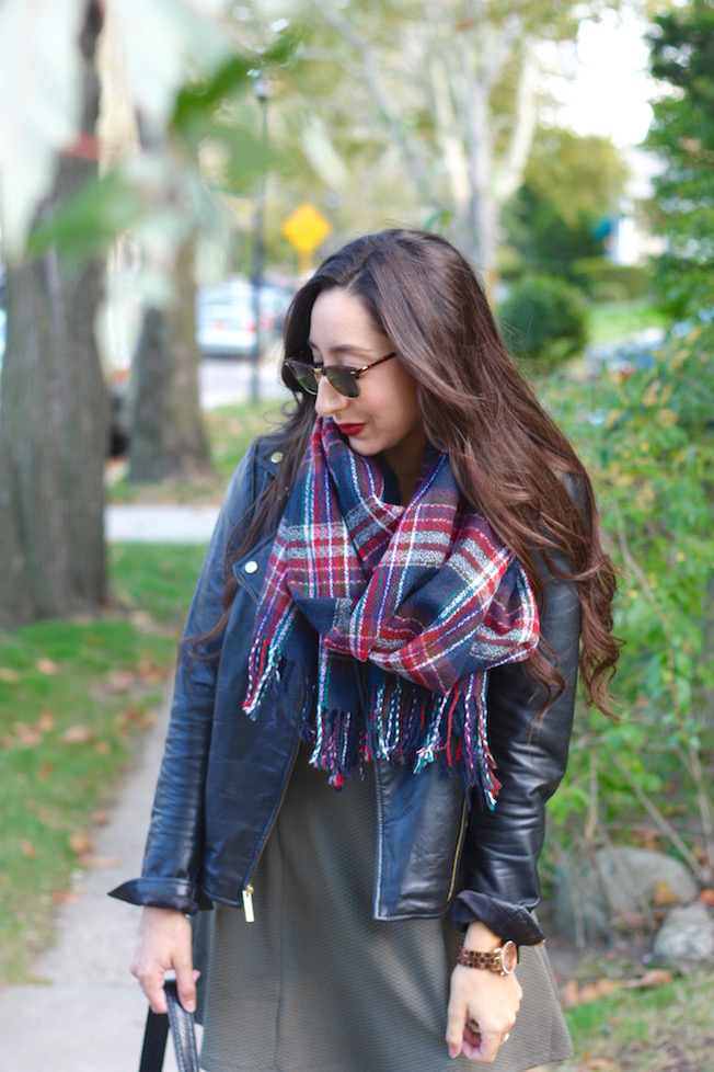 For the chilly temperatures, this dress is perfect to layer with. I added some tights, my leather jacket, and a tartan scarf. I can just see myself wearing this again around Thanksgiving or Christmas time (my favorite!!!) because it’s so festive!