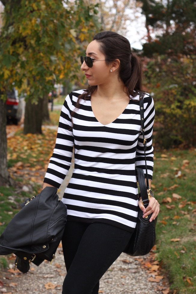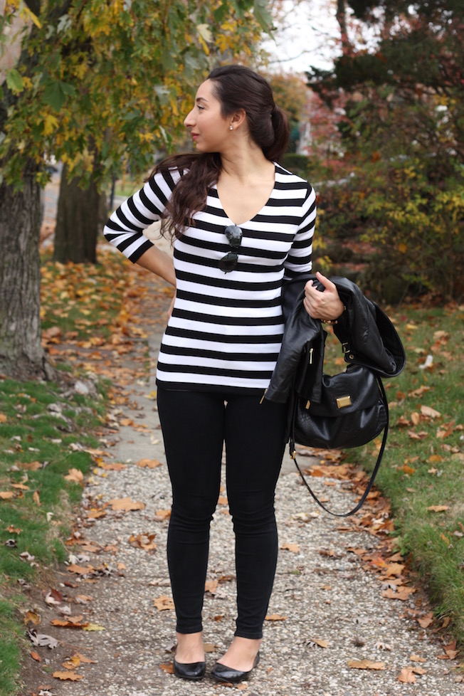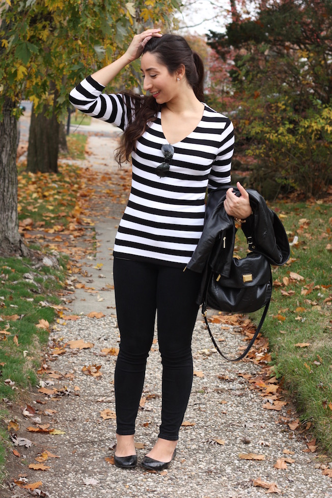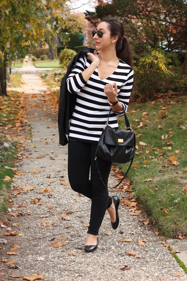 Striped Top: INC International Concepts (On sale for just $25.99!) // Jeans: BDG // Flats: Mossimo // Leather Jacket: Bebe (Similar here and here!) // Bag: Marc by Marc Jacobs // Sunglasses: Ray-Ban // Watch: Michael Kors