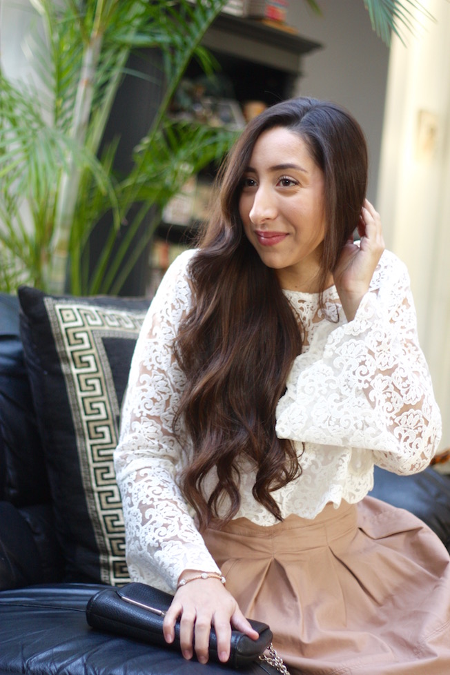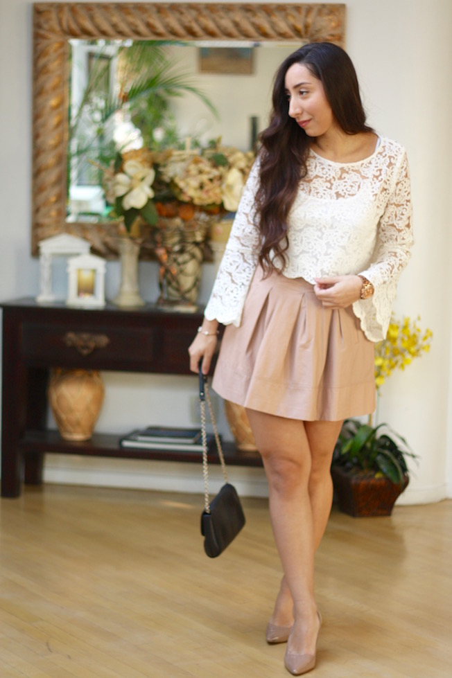 Lace Top: LC Lauren Conrad (On sale for $24!) | Blush Faux Leather Skirt: Forever 21 (Extremely Similar Here!) | Nude Pumps: BCBGeneration (Also similar here and here) | Black Clutch Purse: Coach (Newer version of this Coach bag here) | Rose Gold Watch: Marc by Marc Jacobs (On sale and an awesome gift for someone!) | Double Stud Pearl Earrings: Stylezog