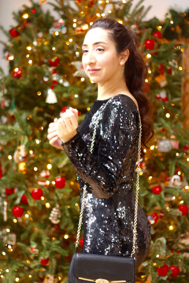 Holiday party style isn’t always about sparkles and sequins, but for me, New Year’s Eve is! There’s just something so special about dressing up in sparkle and shine for a party or gathering at this time of year. When I saw the back of this dress in Nordstrom, I had to try it on and I fell in love. An open back is always just such a stunning feature on a dress! Especially this one. It’s extremely fancy and glamorous being skin-tight and covered in sequins but without the back I don’t know if it would be the same.