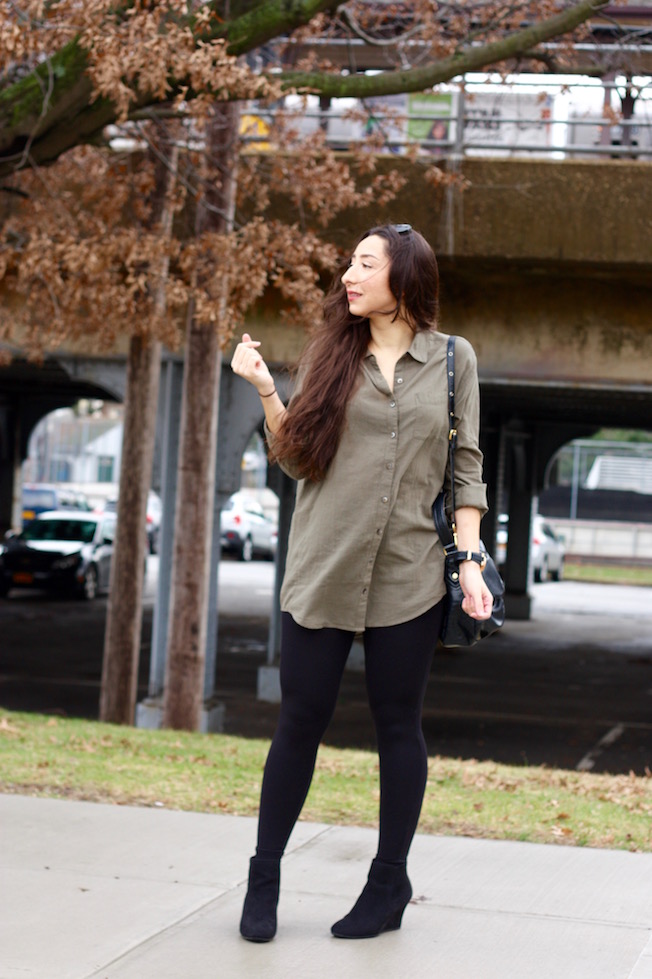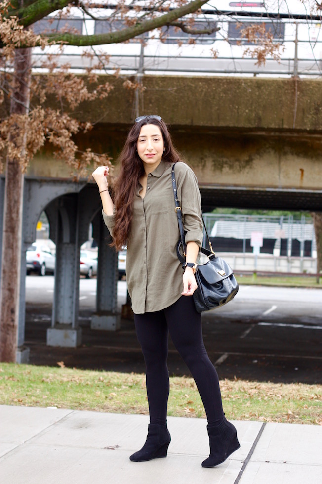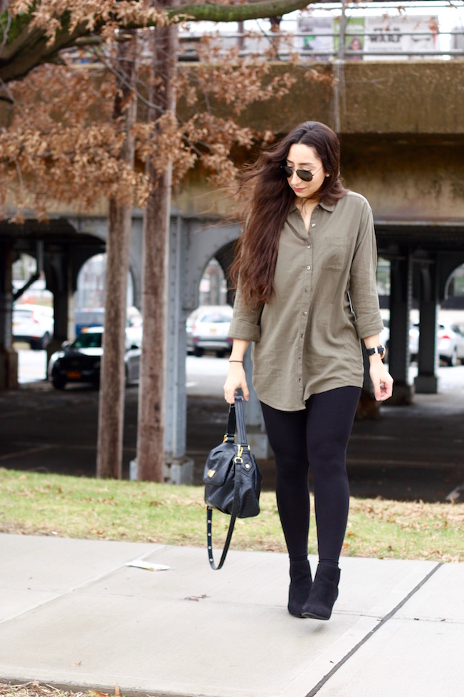 Boyfriend Shirt: Caslon | Leggings: Gap | Wedge Booties: Gap (Similar Here!) | Bag: Marc by Marc Jacobs | Watch: Michael Kors | Sunglasses: Ray-Ban