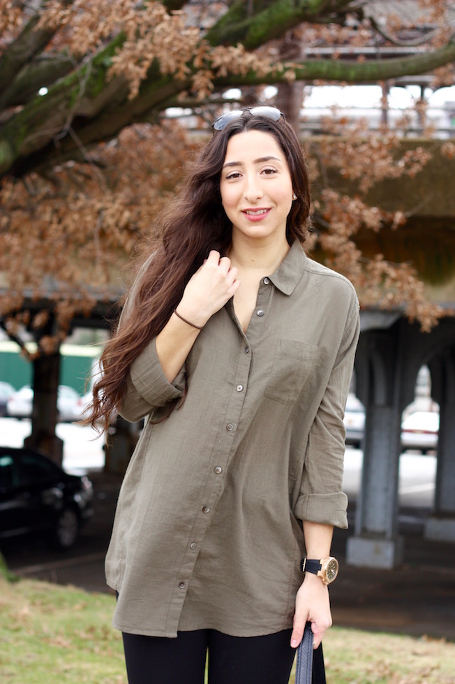 Boyfriend. Jk I got it from Nordstrom. But isn’t this boyfriend fit shirt so cute? I love any shirt thats super baggy to pair with tight jeans or leggings, it just the perfect combo. A nice quality boyfriend shirt fits well and is good to pair with just about anything. It’s great for all times of the year. Now, during the winter, it’s great to wear on it’s own or layer under a sweater and have it peaking out. This one is one of my favorite colors recently, olive, which is a great neutral. This shirt is also super light (and soft!) so you can wear it closed or open with a tee shirt under neither. It’ll be perfect during the warmer months and I can’t wait to start layering this over some sundresses or using it as a cover-up over a bathing suit with some shorts. I’m even picturing it with denim shorts, a belt around my waist and some sandal wedges for a summer’s night out ::heart-eyes emoji::