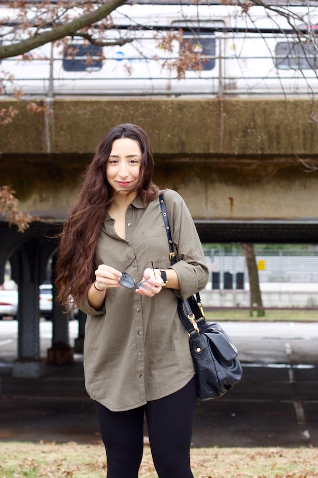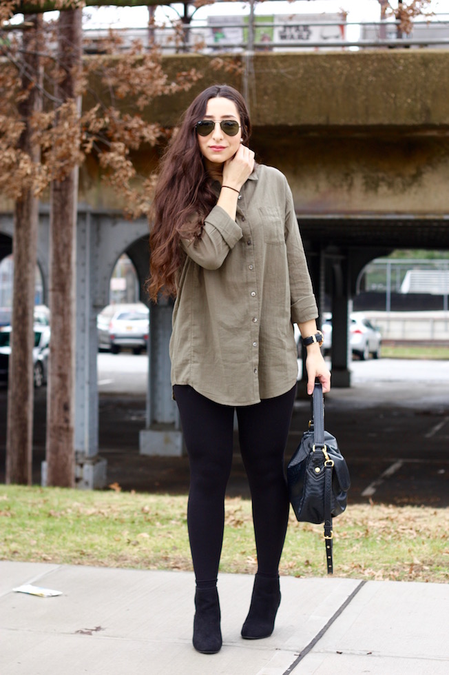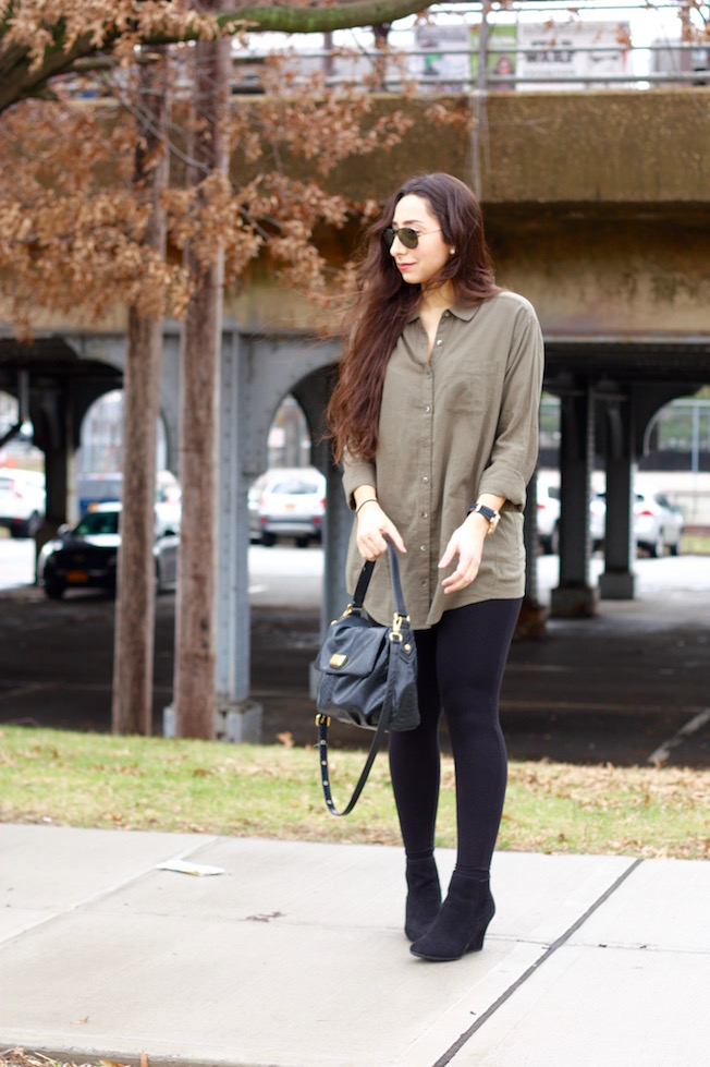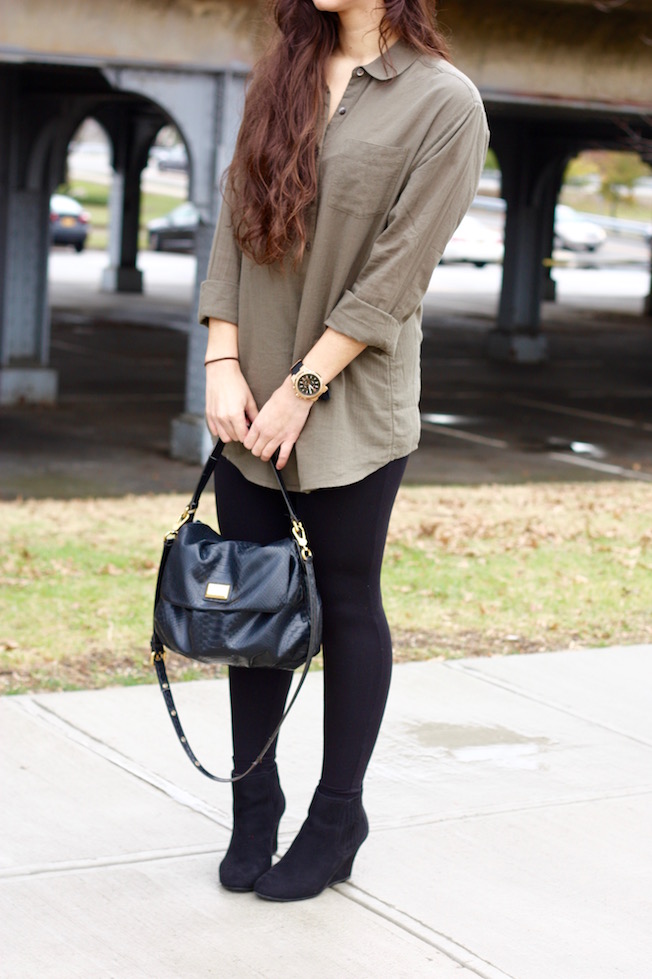 Boyfriend Shirt: Caslon | Leggings: Gap | Wedge Booties: Gap (Similar Here!) | Bag: Marc by Marc Jacobs | Watch: Michael Kors | Sunglasses: Ray-Ban