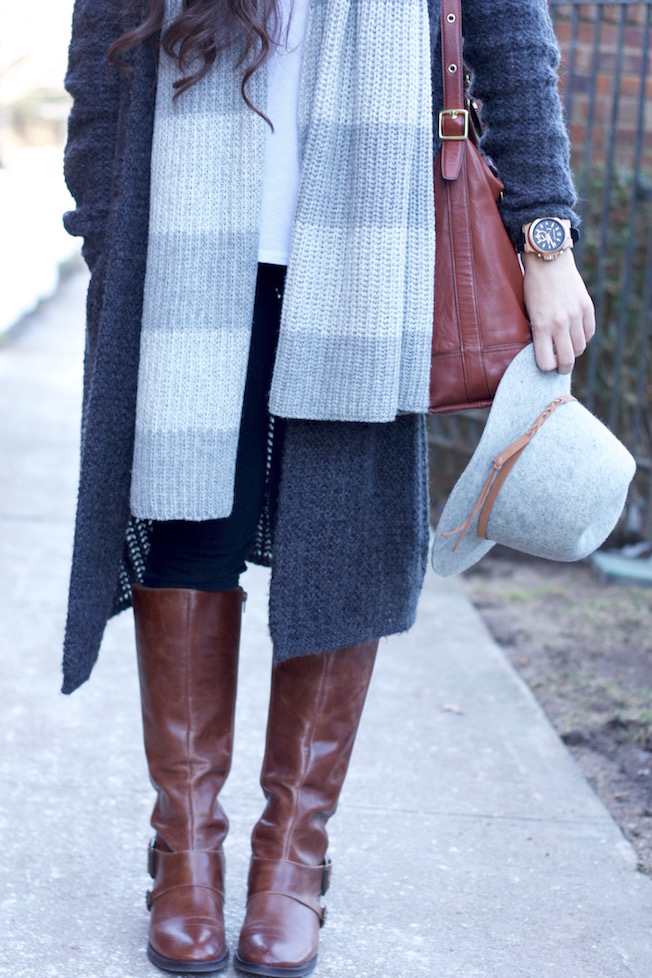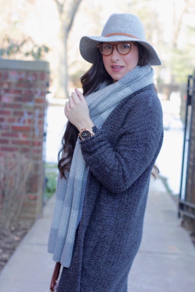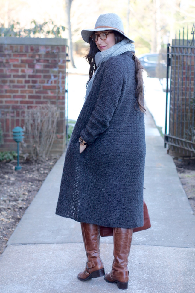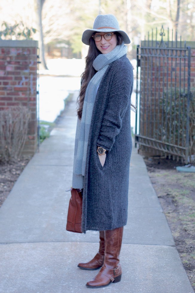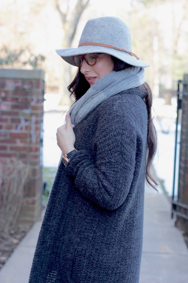 Cardigan: Halogen – Sold out – Similar herehere, and here | Shirt: Halogen | Leggings: Gap (best leggings in the world!) | Boots: old via Matisse – very similar here and here | Bag: old via Coach – Similar here | Hat: Merona (at Target) | Glasses: Forever 21 | Watch: Michael Kors