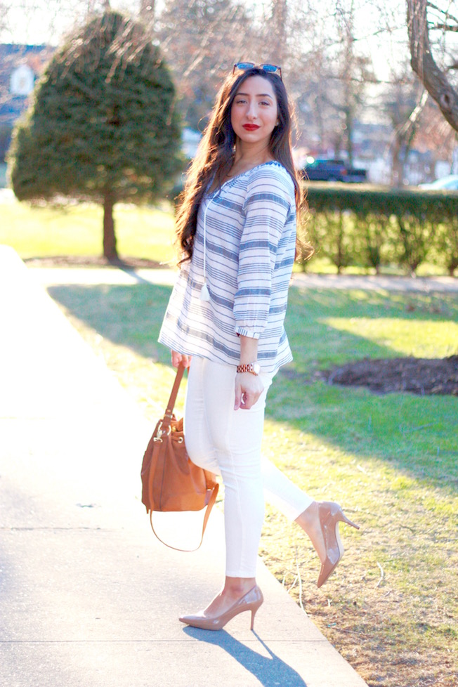 I know what you mean about Spring in the air. 🙂 So excited too. I love your white jeggings! They look so modern and fresh. The heels neutral patent leather heels are so gorgeous too. Very nice transition outfit. 🙂