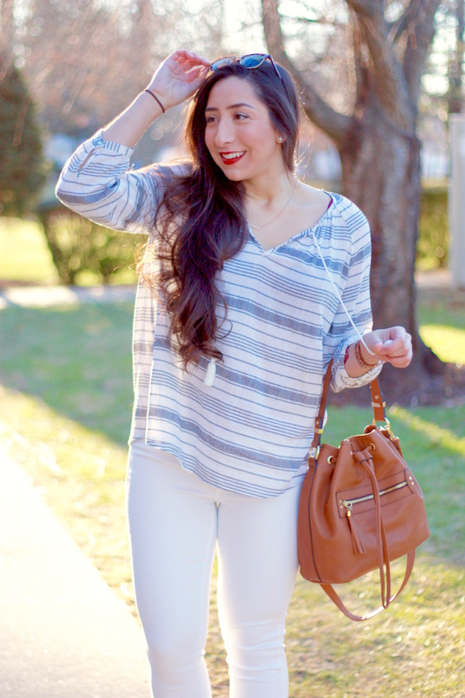 I was in Target recently and they just have a so much light and pretty spring stuff, I went absolutely nuts! I’ve been looking for white jeans forever but I can never commit to a pair because they either too expensive or they just don’t fit right. These are jeggings so they’re super comfortable and don’t stretch out. As soon as I found them I had no problem picking out a bunch of different tops to pair with them for some cute spring outfits. White jeans are such a great staple for spring and summer! My tunic top is also a great light summer top that you can dress up or down with some shorts and sandals.