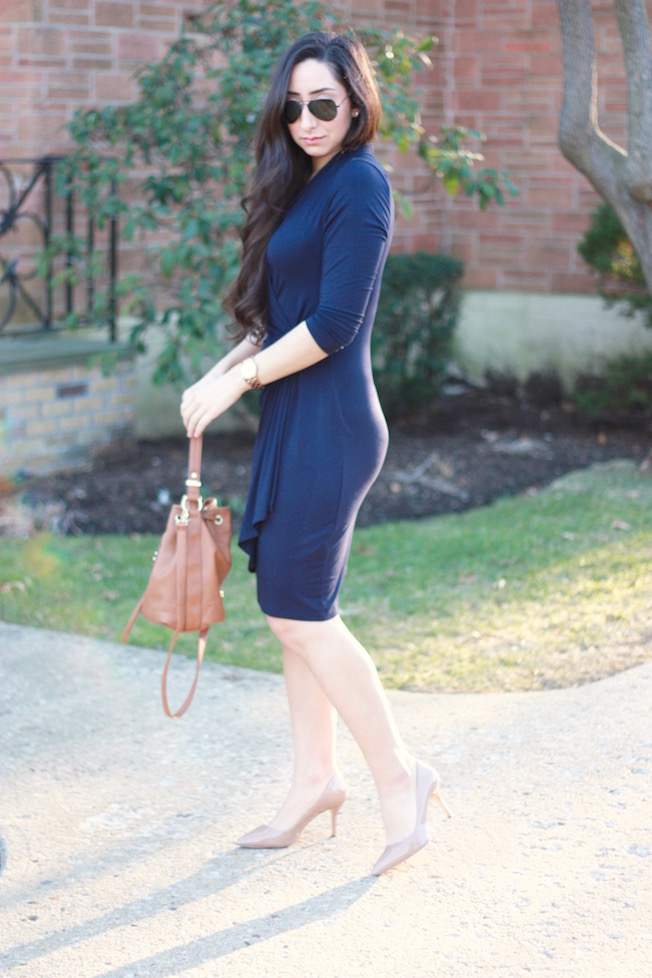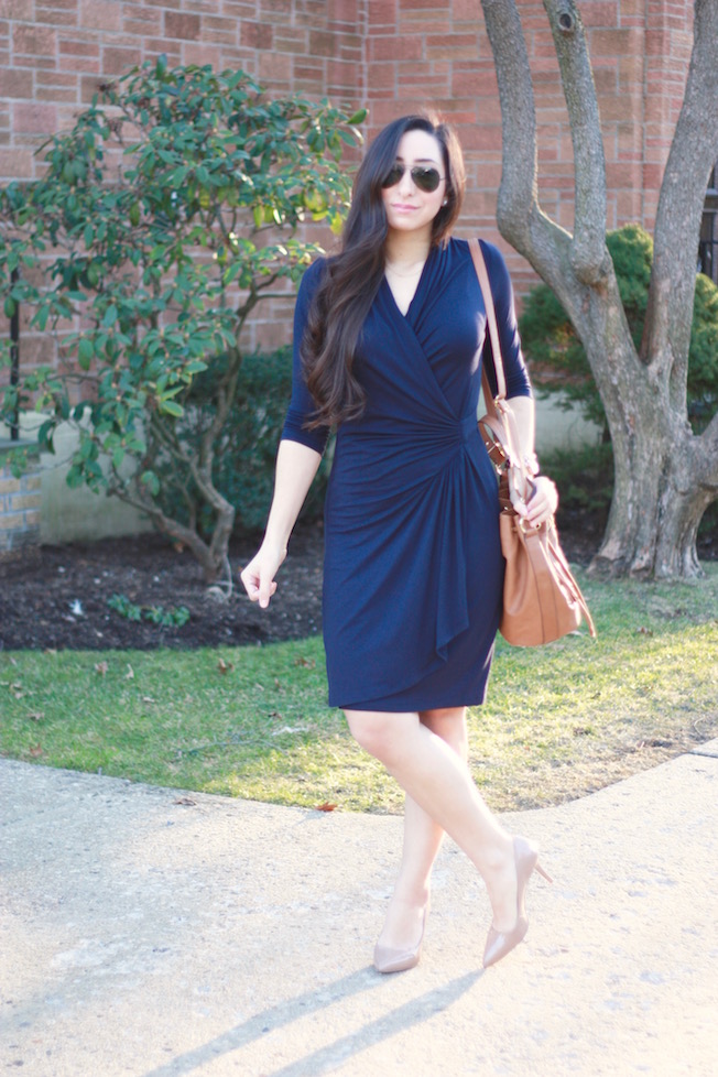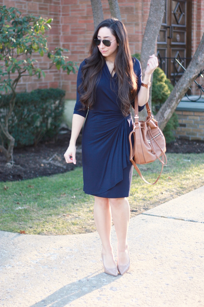 Wrap Dress: Karen Kane | Bag: A+ | Heels: BCBGeneration | Sunglasses: Ray-Ban | Watch: Marc by Marc Jacobs | Earrings: Nordstrom
