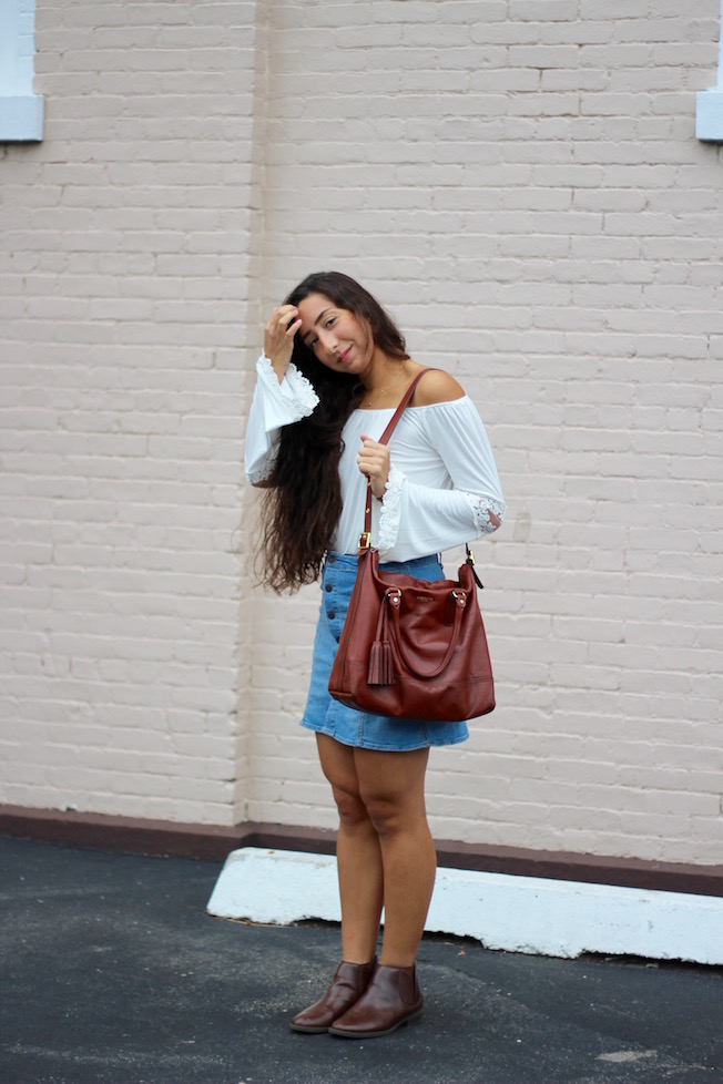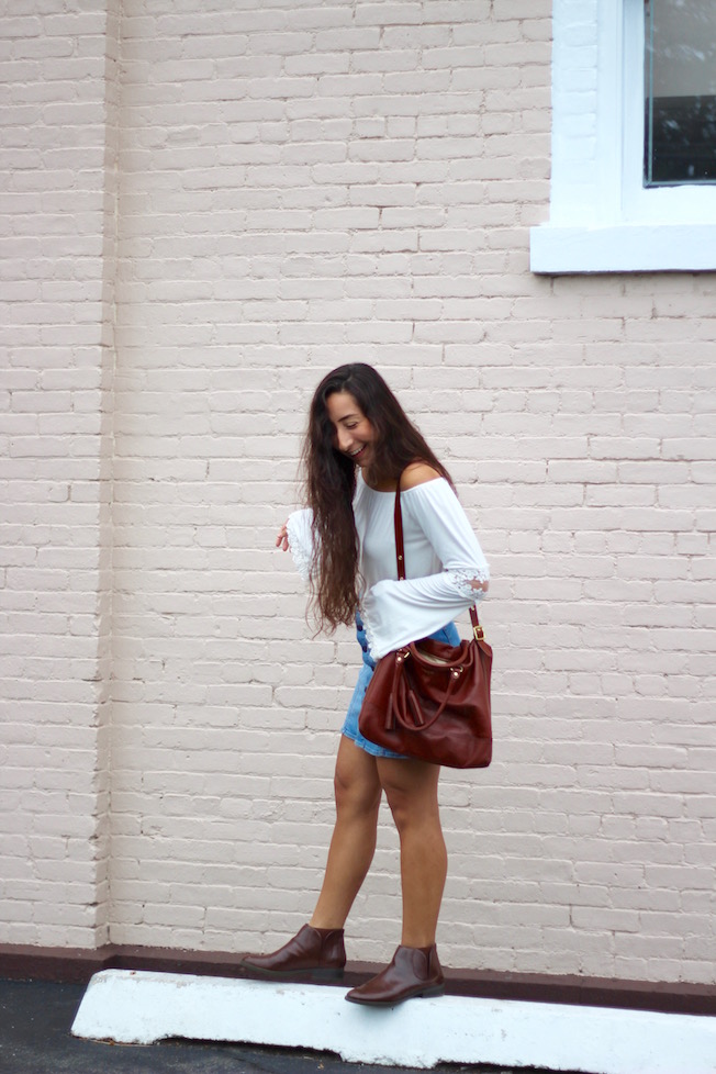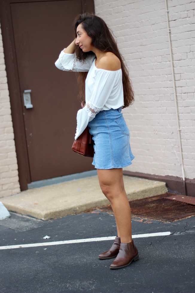 I wore this top and this skirt all summer long. They were two pieces I was obsessed with, both on their own and together. One day when it was particularly warm a few days ago, I figured I could get away with it but I knew it just wouldn’t look right wearing sandals at the end of October in New York. So I was just about to nix the outfit thinking it was too summery, when it hit me: just add booties. BAM. It’s a fall outfit! Add a scarf, jacket, or some tights if it’s a little chillier and I can wear this outfit well up to Thanksgiving!