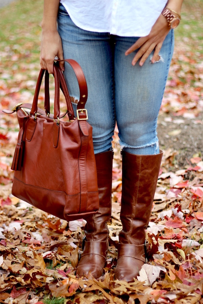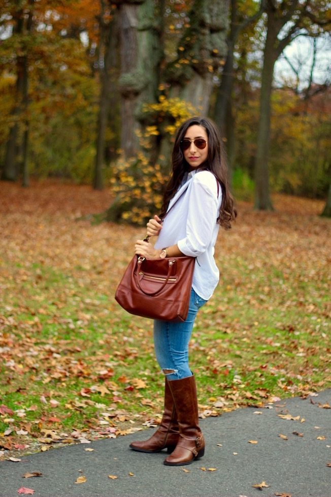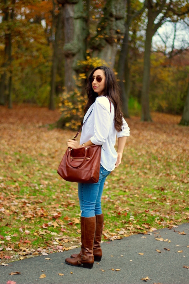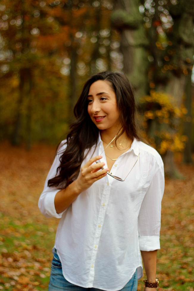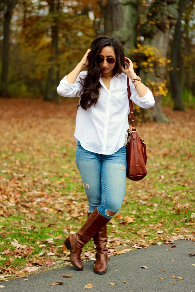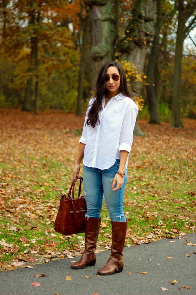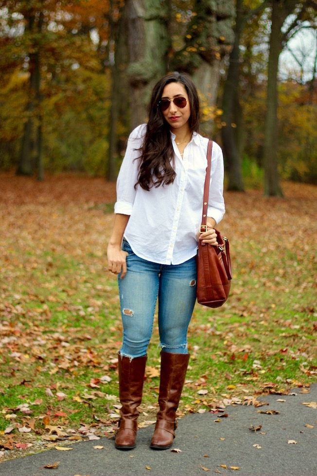 Keep it simple and basic with this outfit because who doesn’t have jeans and a basic white button down in their closet? They’re two versatile pieces that can be used and evolve from season to season. To make the outfit a bit more fall, I wore brown riding boots (you could also do booties) and I added simple, dainty jewelry for just a touch of shine and delicate detail. A white button down always looks so chic and paired with jeans you’ll feel comfortable, casual, and stylish wherever spend Thanksgiving.