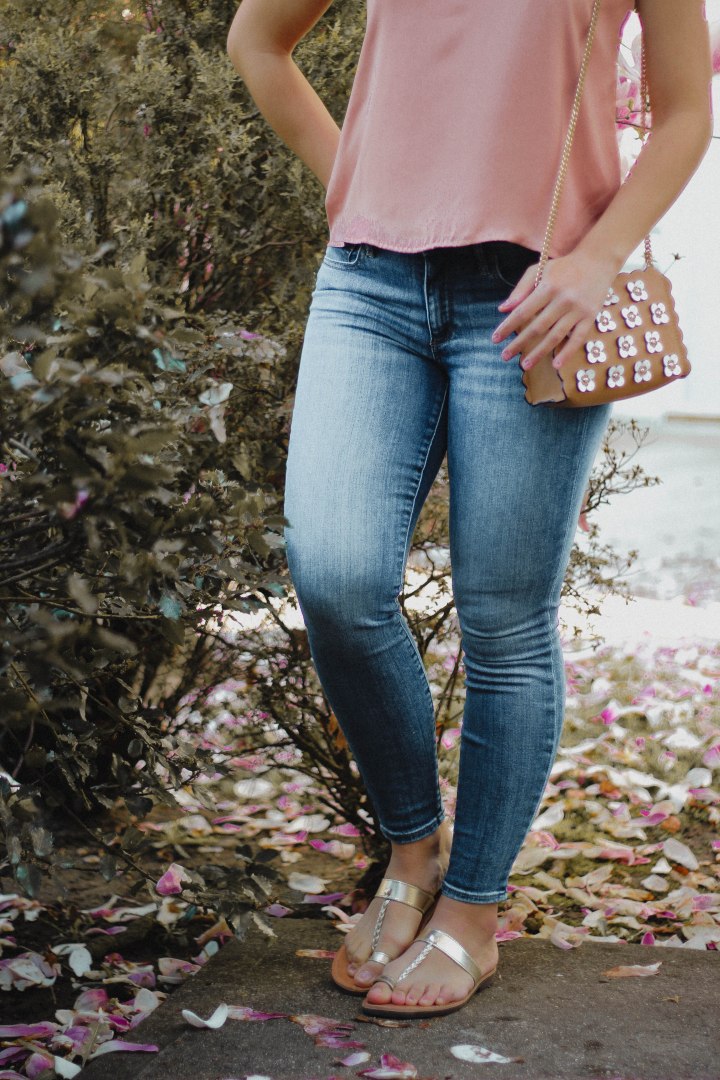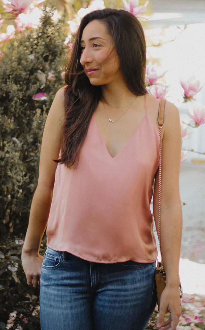 Spring is finally here, the flowers are blooming, and I can finally stop wearing closed shoes and sweaters. It seriously feels so good to just be free and wear clothes that aren’t covering my arms and neck haha. This type of tank top is my go-to during the spring and summer. V-neck and spaghetti strap, loose but not too flowy. It’s perfect for those summer nights when it gets a little chilly, because I can just throw cardigan or denim jacket on top at night and I’m good to go. It goes perfect with jeans, shorts, or dress pants (which makes it so versatile – go from work, to night out, to weekend hangin’ out with no worries.) This top I’m wearing is from TOBI and I’m obsessed with the color! I’ve never really worn much in this salmon/pink color so I’m loving it. I would order a size down because the back comes down pretty low and under the arms seems to have a little extra room.